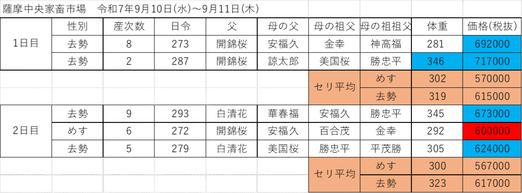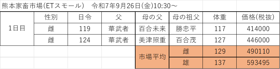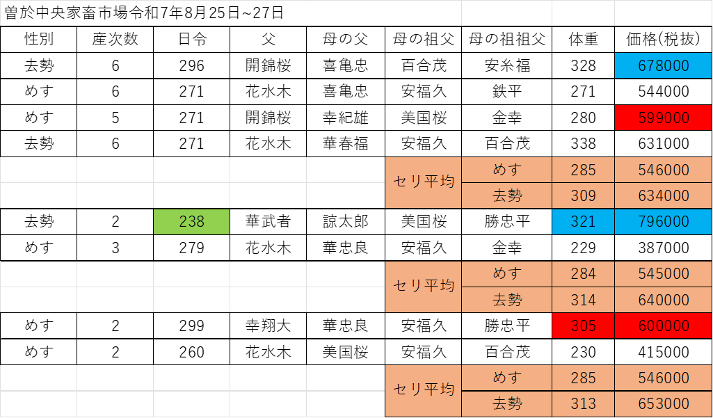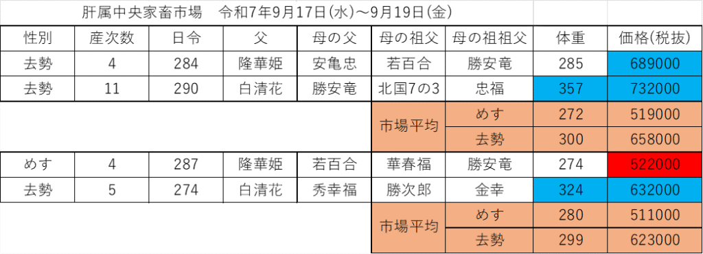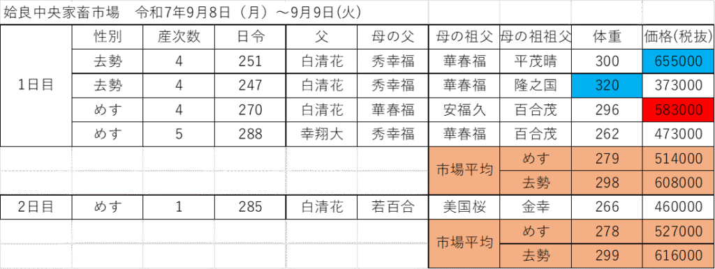 9月については弊社種雄牛産子の上場が少ない月でした。しかしながらそんな中で農家様の御協力で各市場ゼロ頭にはなっていません。出荷していただいている農家様には大変感謝しています!!!全体的に相場が下げ傾向だったように感じます。